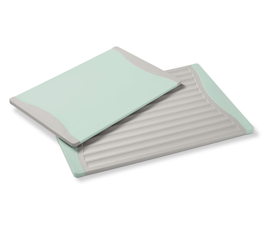 Bei dem grossen Brett kommt noch hinzu, dass es eine Seite mit Rillenstruktur hat, die zum Beispiel zum Auffangen von Flüssigkeiten oder Brotkrümeln dienen kann. Beide Bretter sind beidseitig verwendbar – und mit ihren modernen, frischen Pastellfarben lassen sie sich auch wunderbar zum Servieren nutzen.