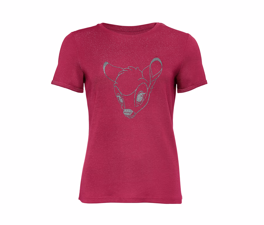 Für einen glänzenden Auftritt sorgt dieses T-Shirt. Gewebt aus effektvoll glänzendem Garn und versehen mit einem silberfarbenen Disney-Motiv, macht das T-Shirt einen besonders edlen Eindruck. Für einen verspielten Touch sorgt dabei das Bambi-Bild auf der Vorderseite des Damen-Shirts. Fixierte Ärmelumschläge sowie ein Rundhalsausschnitt runden den Look ab.