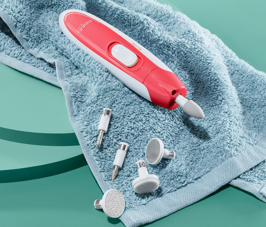 Das handliche Gerät hat einen ergonomisch geformten Griff und die Beleuchtung erlaubt besonders präzises Arbeiten. Mit von der Partie sind sechs verschiedene Aufsätze zum Kürzen und Polieren der Nägel, zum Entfernen von Nagelhaut, Hornhaut und Schwielen sowie zum Polieren der Fussnägel und Fingernägel. Es gibt zwei Geschwindigkeitsstufen und man kann zwischen Rechts- und Linkslauf wählen.