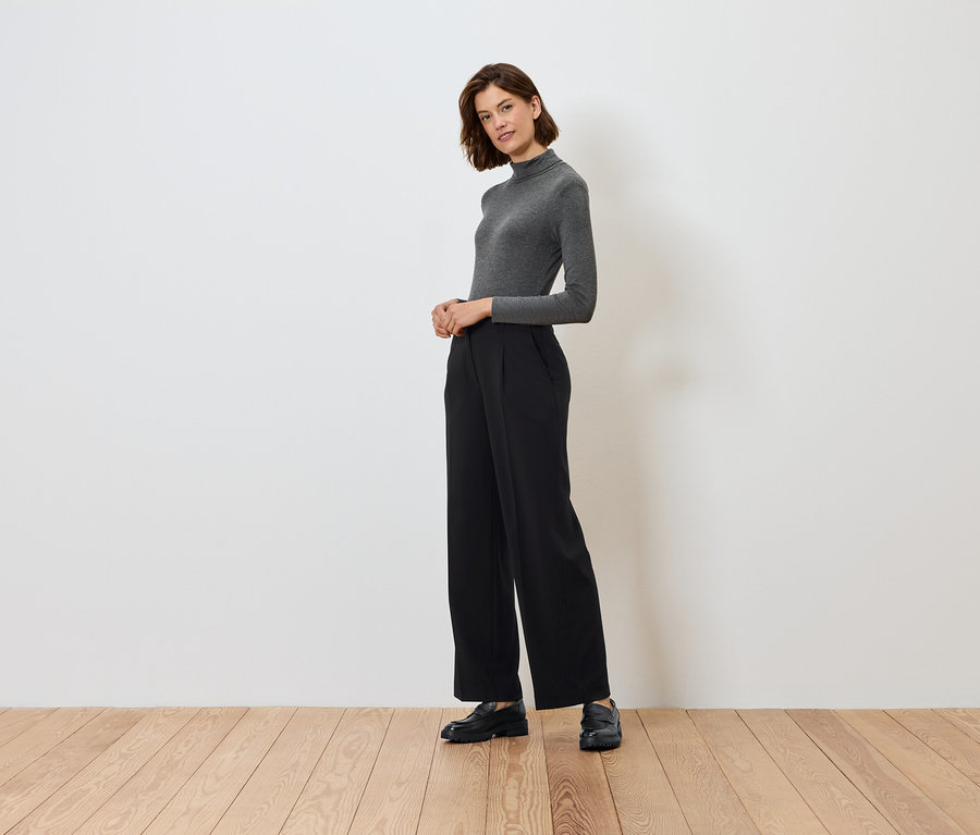 - Elastischer Bund mit Gürtelschlaufen, Reissverschluss, Haken und verdecktem Knopf