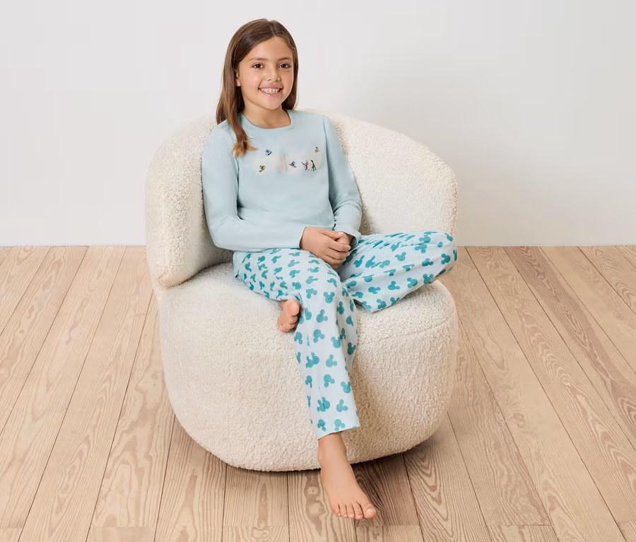 - Oberteil hellblau mit cremefarbenem Print-Schriftzug SNOW und mehrfarbigen Disney-Figuren