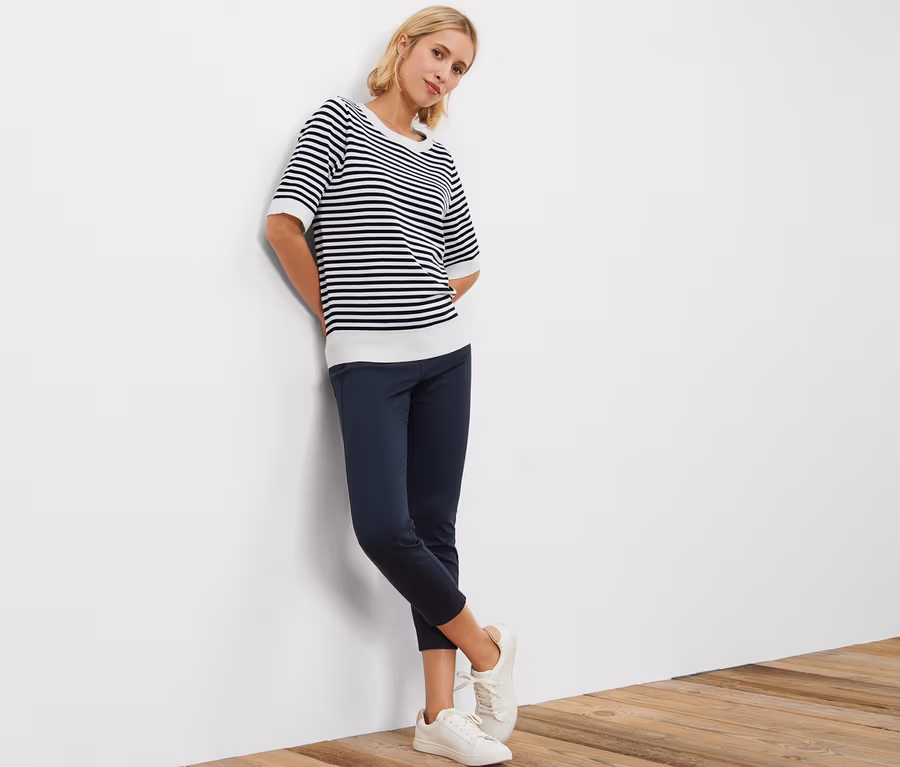 - Elastische Rippbündchen an Ausschnitt, Ärmelabschluss und Saum