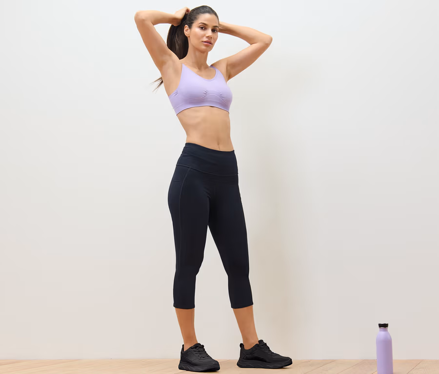 • Damensporthose mit breitem, elastischem und hoch geschnittenem Bund