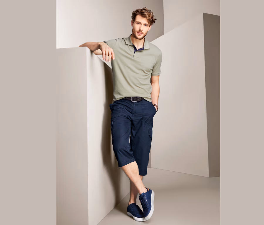 Lange Hose oder kurze Hose? Bermudas stellen einen legeren Kompromiss dar. Und diese Bermudas in ¾-Länge wird mit ihrem leichten Used-Look sogar noch etwas lässiger. Mit ihrem weichen Baumwoll-Twill aus reiner Bio-Baumwolle liegt die Freizeithose jederzeit angenehm auf der Haut und ist ideal für wärmere Tage geeignet. Die Herrenhose hat zwei seitliche Eingrifftaschen, zwei Gesässpatentaschen und zwei seitliche Beintaschen im Stil einer klassischen Cargohose.