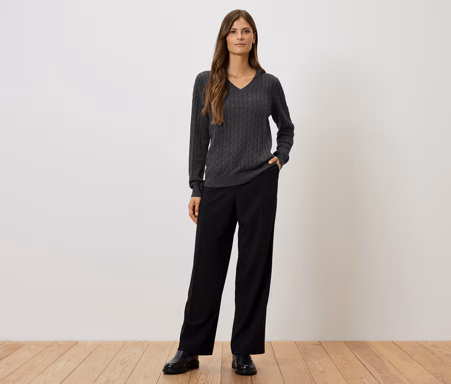 - Elastische Rippbündchen an Ausschnitt, Ärmelabschluss und Saum