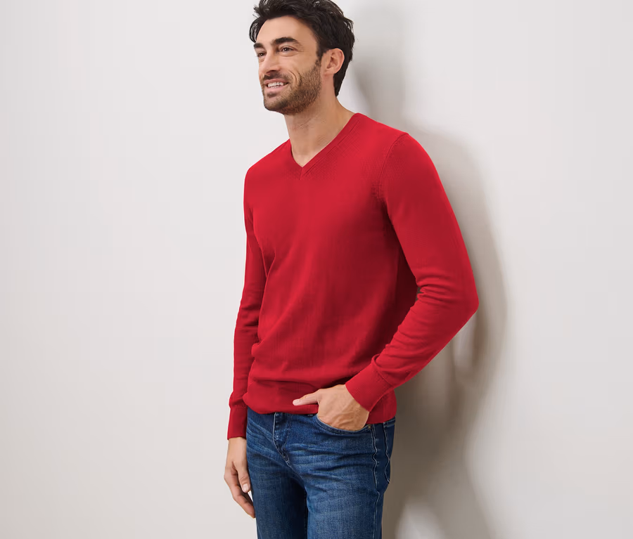 - Rippstrickbündchen an Ausschnitt, Ärmeln und Saum
