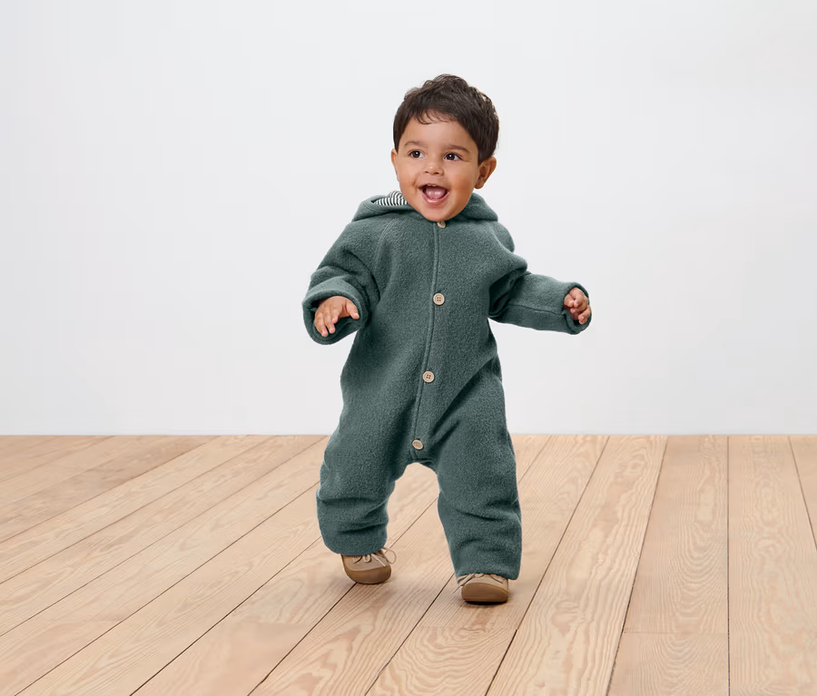 • Gr. 50/56 – 74/80: Bein- und Armabschluss mit Umschlag gegen kalte Füsse und Hände