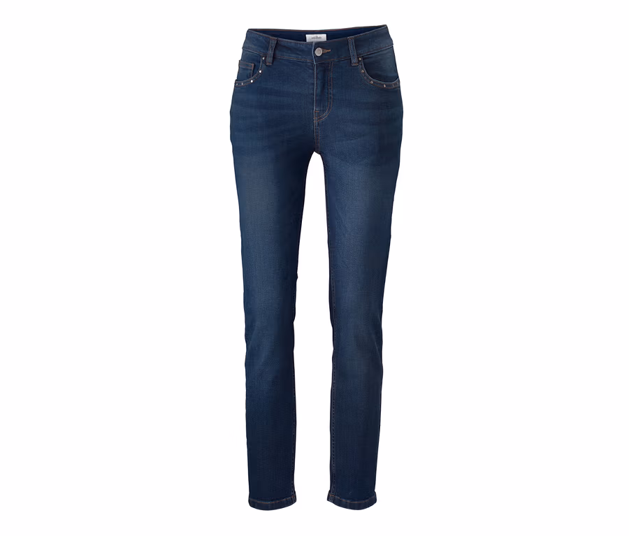 Die Damenhose ist in weicher Baumwoll-Stretch-Qualität mit Elasthan gefertigt. Das macht sie wunderbar bequem, verleiht ihr Formbeständigkeit und sorgt in jeder Situation für den optimalen Sitz. Aber auch optisch kann die Hose im klassischen 5-Pocket-Style Punkte sammeln: Durch ihre leichte Waschung hat sie einen legeren Used-Look und der Nietenbesatz am vorderen Tascheneingriff setzt einen hübschen Akzent. Sie ist mit Gürtelschlaufen versehen und wird mit Reissverschluss sowie Knopf geschlossen.