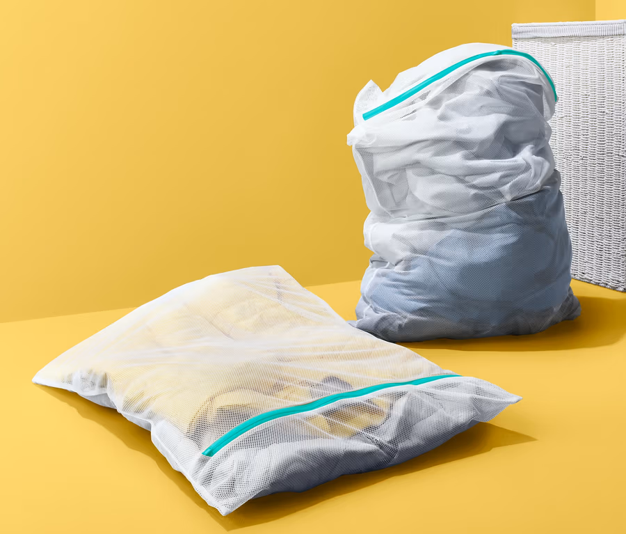 Die XL-Wäschenetze aus recyceltem Polyester fassen einmal etwa drei und einmal etwa fünf Kilo Wäsche – ideal auch für Jacken oder Kissen. Empfindliche Textilien wie Feinwäsche werden darin deutlich schonender gereinigt und die Zipper-Abdeckung der Reissverschlüsse schützt gleichzeitig die Wäsche und die Waschmaschine selbst.
