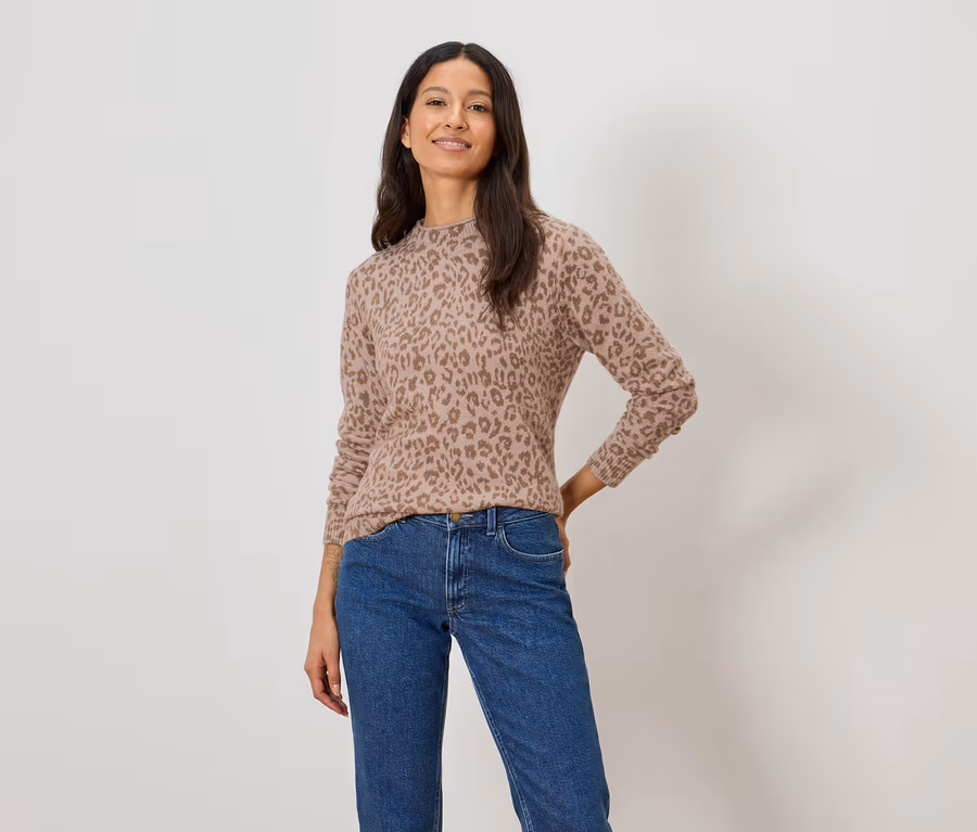 Strickpullover mit Stehkragen, beige meliert mit hellbraunem Leo-Alloverprint