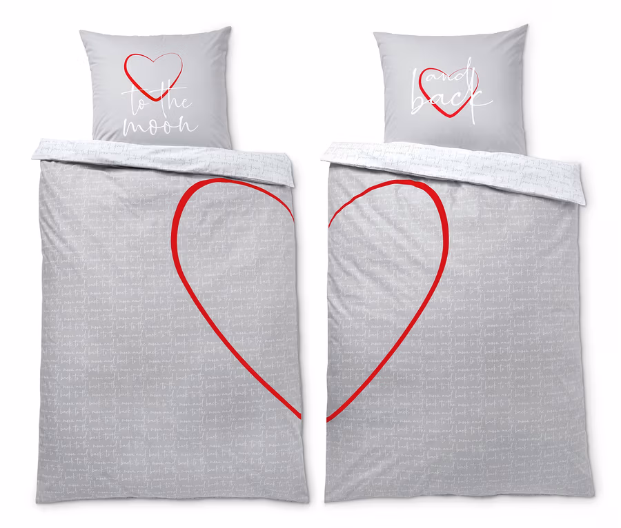 Und weil man das nicht oft genug sagen kann, ist die Bettwäsche auf einer Seite flächendeckend mit der schönen Liebeserklärung bedruckt, die andere Seite wird zusätzlich von je einer Hälfte eines Herzens geziert. Die perfekte Bettwäsche für sie und ihn, sie und sie oder ihn und ihn – kurz: für alle, die zusammengehören.