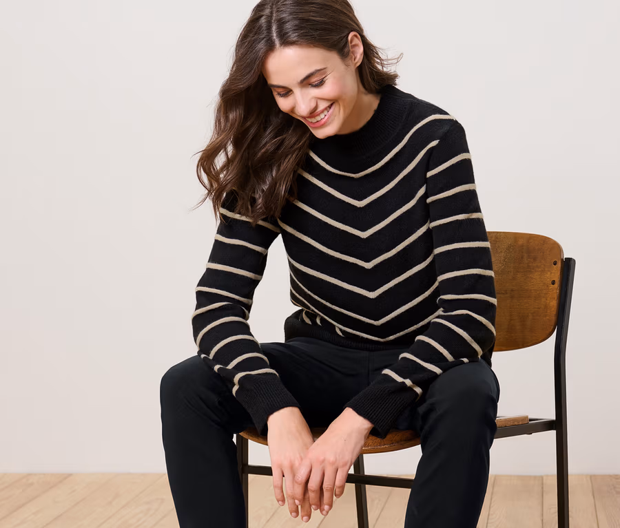 Gestreifter Strickpullover mit Stehkragen, schwarz