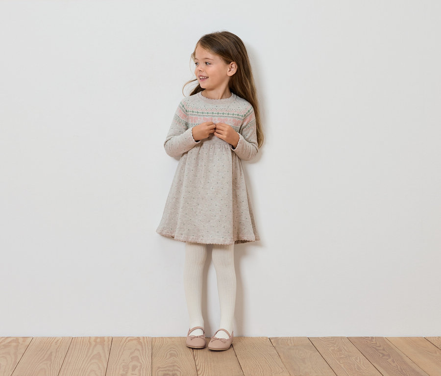 Beige meliert mit pastellrosa-silberfarben-salbeigrünem Norweger-Einstrick