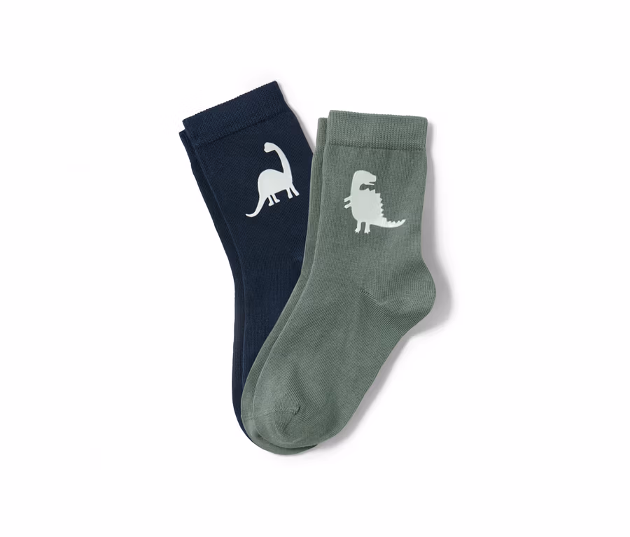 - 1x dunkelblau mit fluoreszierendem Dino-Print, 1x tannengrün mit fluoreszierendem Dino-Print