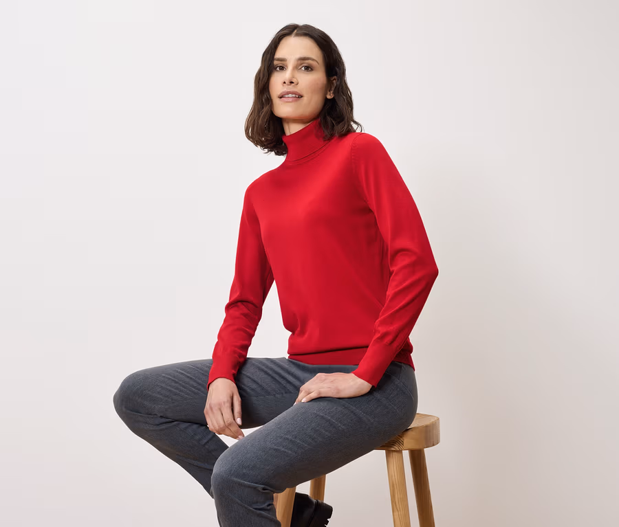 - Elastische Rippbündchen an Rollkragen, Ärmelabschluss und Saum