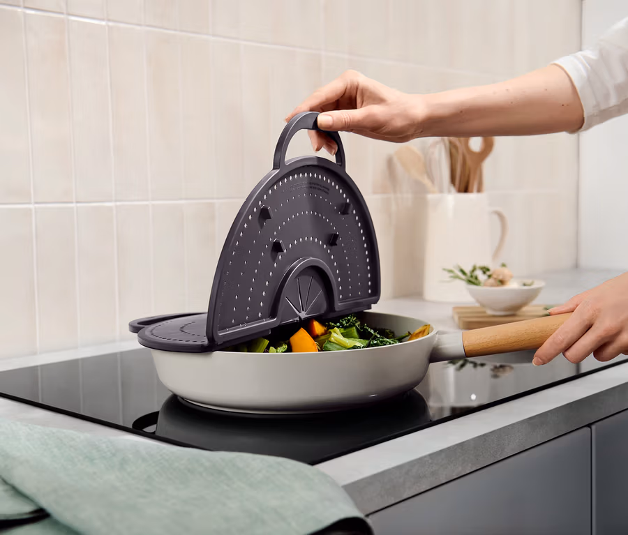 - Klappbar – für freien Blick in die Pfanne und zur platzsparenden Aufbewahrung