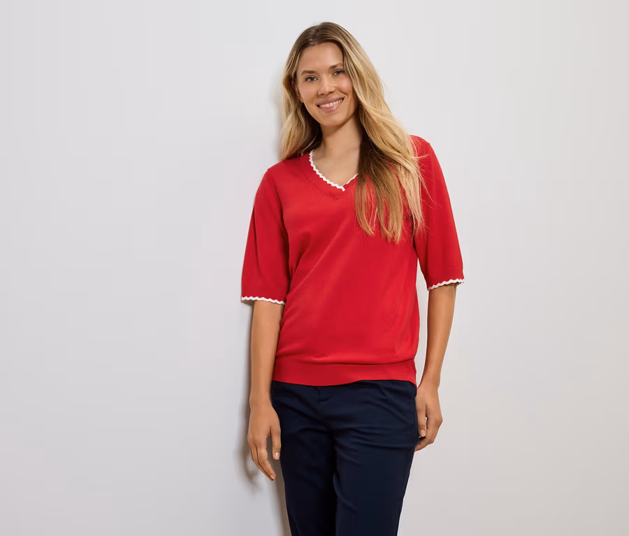 - Farblich abgesetzte Wellenkante an Ausschnitt und Armabschluss