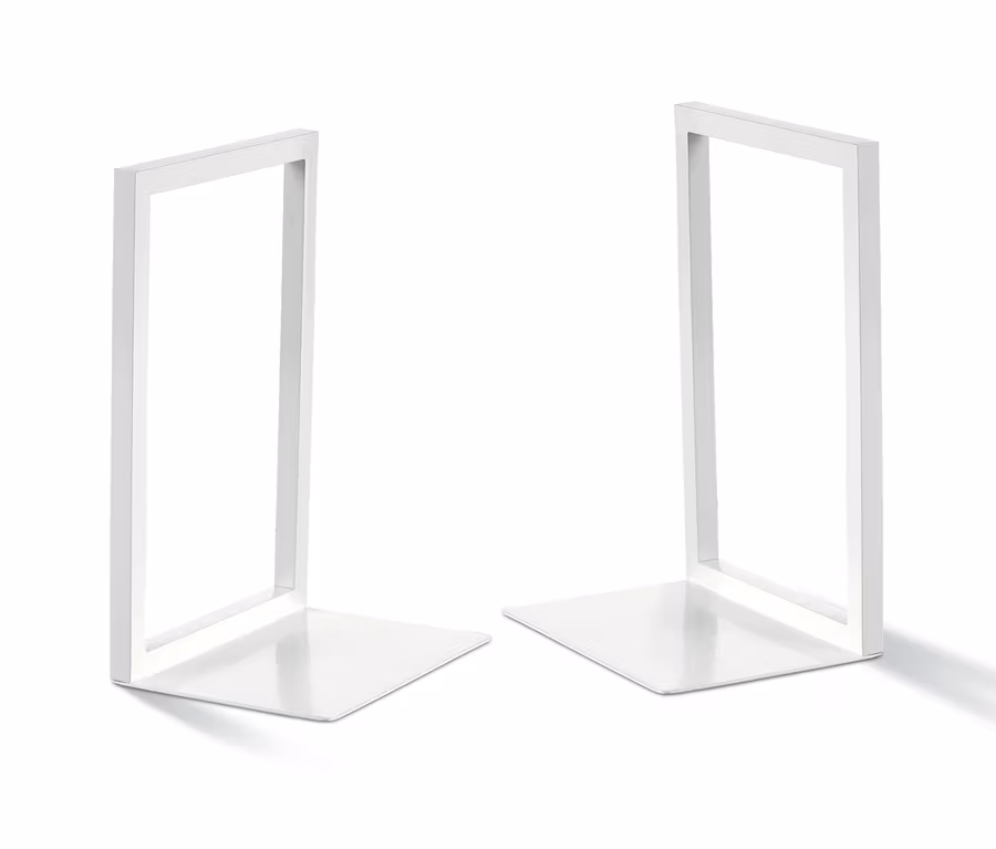 Sicherer Halt und stilvolle Deko: Diese beiden Buchstützen im filigranen Design halten Bücher, Zeitschriften, Ordner & Co. auch freistehend zuverlässig aufrecht. Die Stützen sind aus pulverbeschichtetem Metall gefertigt und lassen sich in beliebigem Abstand voneinander auf Regalen, Kommoden oder anderen Möbeln platzieren. Mit ihren Antirutsch-Füssen haben sie auch auf glatten Oberflächen einen sicheren Stand.