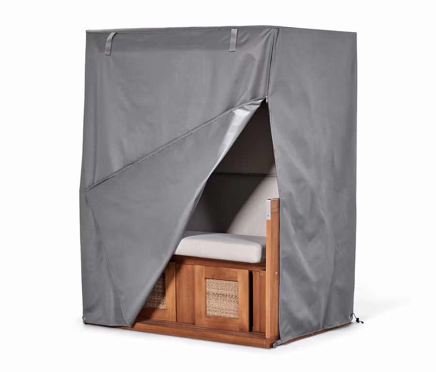 - 2 Reissverschlüsse an den vorderen Ecken zur Nutzung des Strandkorbes bei übergestülpter Abdeckhaube