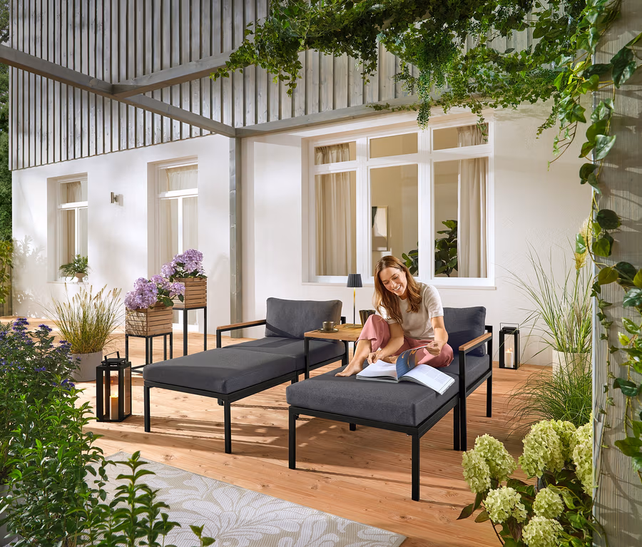 - Polsterbezüge aus hochwertigem Olefinstoff, Haptik und Optik erinnern an einen Indoor-Stoff