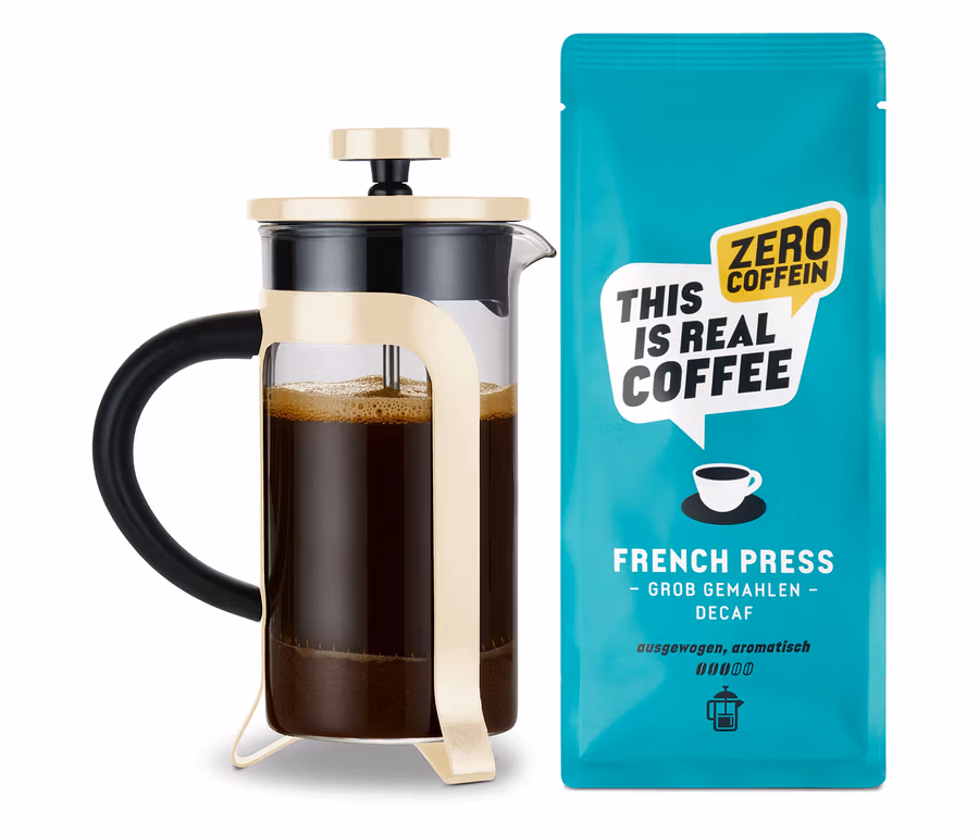 - Set beinhaltet 1 x This is real Coffee French Press Decaf Filterkaffee, entkoffeiniert (200 g Gemahlen) und 1 x Siebstempelkanne (300 ml) in friendly beige