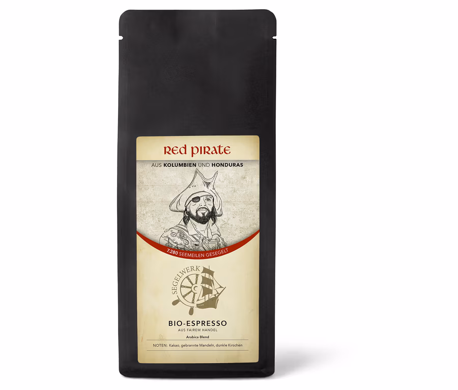 "Der Kaffee ist so dunkel, wie die Seele des Roten Piraten!" ... Im Ernst: Wir lieben diesen Kaffee, weil er so wunderbar kräftig ist und nach Kakao schmeckt. Fruchtnoten gibt es kaum, auch Säuren finden sich nur gering. Er ist – trotz seines finsteren Anblicks – sehr sympathisch und ausgewogen. Sozusagen ein Pirat des Herzens!