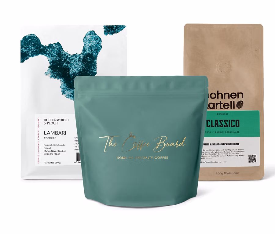 - Set beinhaltet 1x Classico Espresso von Bohnenkartell, 1x Dark Oak Espresso von The Coffee Board, 1x Lambari Espresso von Hoppenworth & Ploch