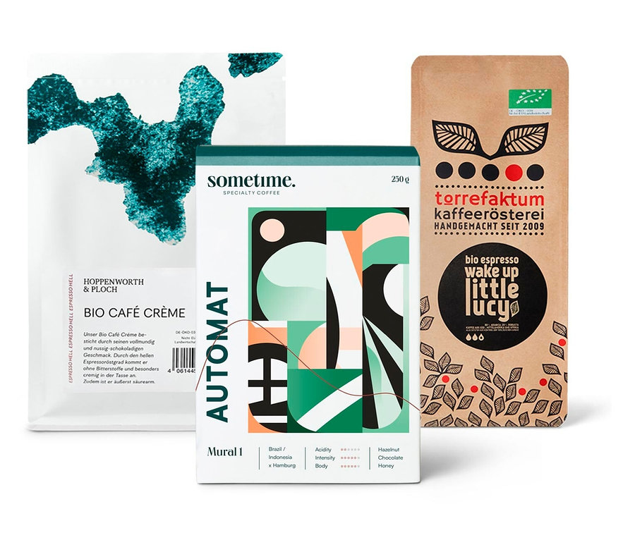 - Set beinhaltet 1 x Bio Café Crème von Hoppenworth & Ploch, 1 x Mural Caffè Crema von sometime und 1 x Bio Wake Up Espresso von Torrefaktum