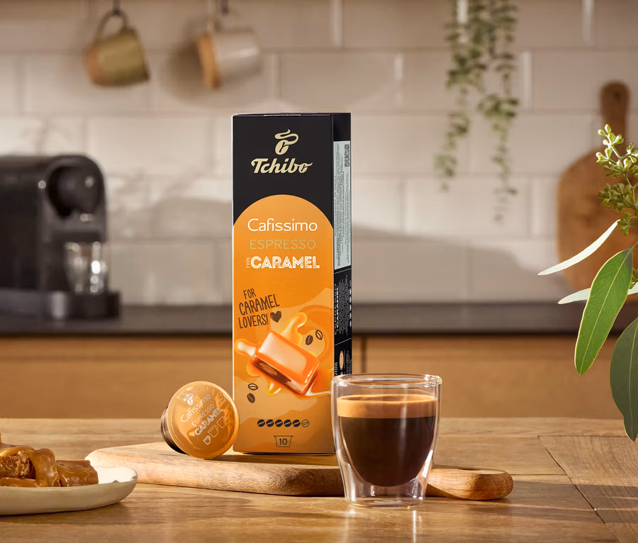 Espresso trifft natürliches Aroma: Unser neuer Espresso Caramel kombiniert ausgewogenen Espressogenuss mit einer feinen Sahne-Karamellnote und sorgt so für ein aussergewöhnliches Geschmackserlebnis.