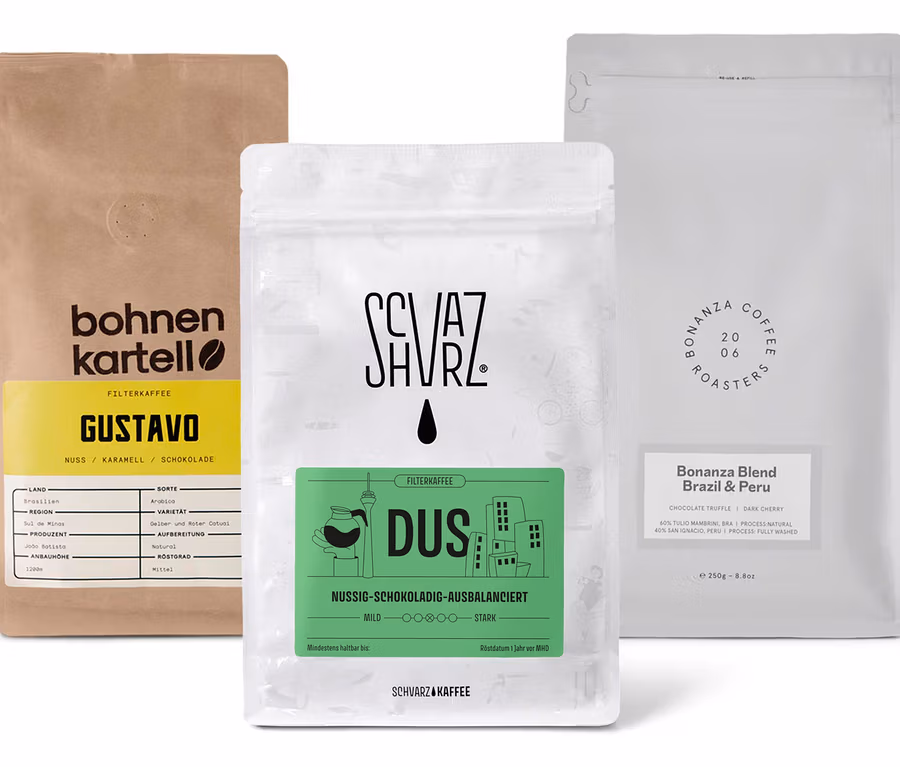 - Set beinhaltet 1x Blend Omni-Roast von Bonanza, 1x DUS Filterkaffee von Schvarz, 1x Gustavo Filterkaffee von Bohnenkartell