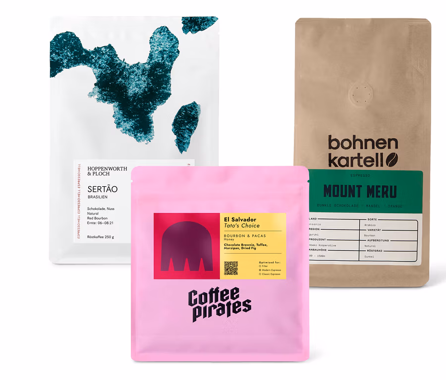 - Set beinhaltet 1x Sertao Espresso von Hoppenworth & Ploch, 1x El Salvador Tato´s Choice Espresso von Coffee Pirates, 1x Mount Meru von bohnenkartell
